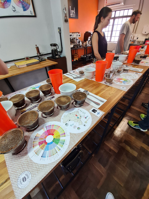 Foi extremamente interessante participar desse evento e poder provar pães (incluindo o melhor panetone que já provei) e degustar cafés. Mas o destaque foi participar de um workshop de cupping, que nada mais é do que a forma pela qual os degustadores (Q-Graders) do mundo do café provam cafés para entender seu sensorial, detectar defeitos na torra, nos grãos, etc. É um método bem simples: basta moer o café em uma moagem que eu considero média-fina e infusioná-lo por quatro minutos. Claro que existe uma proporção envolvida, mas não entrarei em mais detalhes aqui. Essa experiência foi intrigante, pois pude notar como as outras pessoas percebem diferentes cafés, e quais suas preferências. Além de que, provar cafés bem diferentes um ao lado do outro nos permite perceber com muito mais facilidades as nuances de cada um; recomendo que você tente fazer isso em casa.